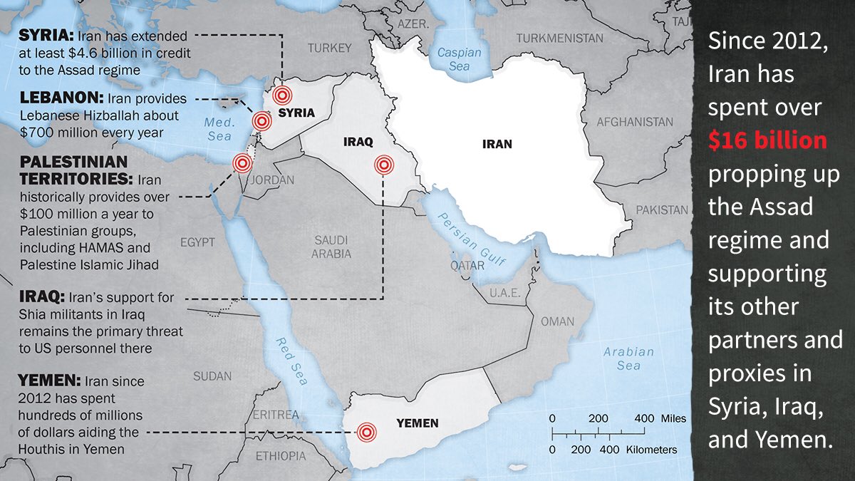 מאז שנת 2012 אירן השקיעה במדינות הפרוקסי שלה יותר מ-16 מיליארד דולר תוך שהיא מפיחה חיים מחדש במשטר אסד ותומכת בכוחות בעירק ,סוריה,לבנון ותימן.