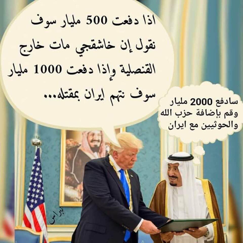 קריקטורות הקומבינה האמריקאית-סעודית בנושא חשוגי 14/10/2018 Nziv 0 תגובות ארה"ב, סעודיה טראמפ: אם תשלם 500 מיליארד דולר נגיד שחשוגי בכלל מת מחוץ לקונסוליה הסעודית בטורקיה אבל אם תשלם 1000 מיליארד דולר נסכים להאשים את אירן ברציחתו….. המלך הסעודי: אשלם 2000 מיליארד דולר ונכלול בזה גם השמדת החיזבאללה והחותים בתימן יחד עם אירן…..