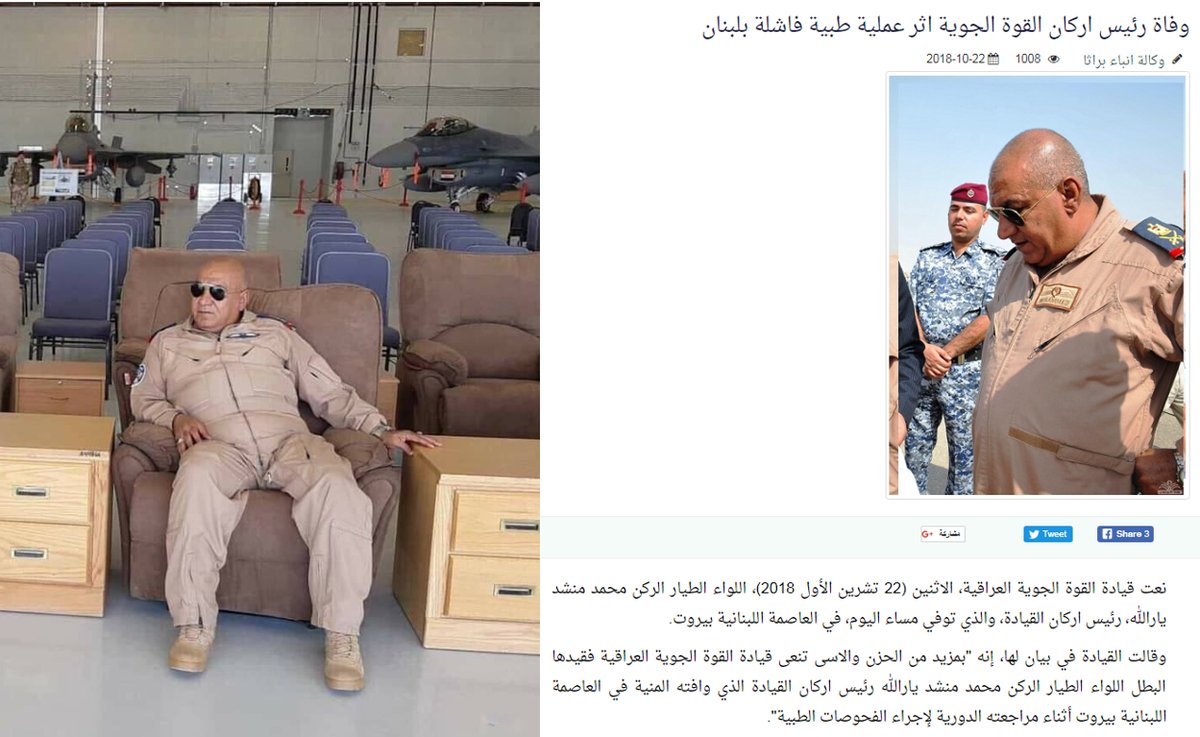 סוכנות הידיעות העירקית – ברת’א מדווחת כי האלוף טייס מוחמד מנשד יאראללה – מפקד חיל האוויר העירקי מת על שולחן הניתוחים במהלך ניתוח בבית חולים בלבנון.