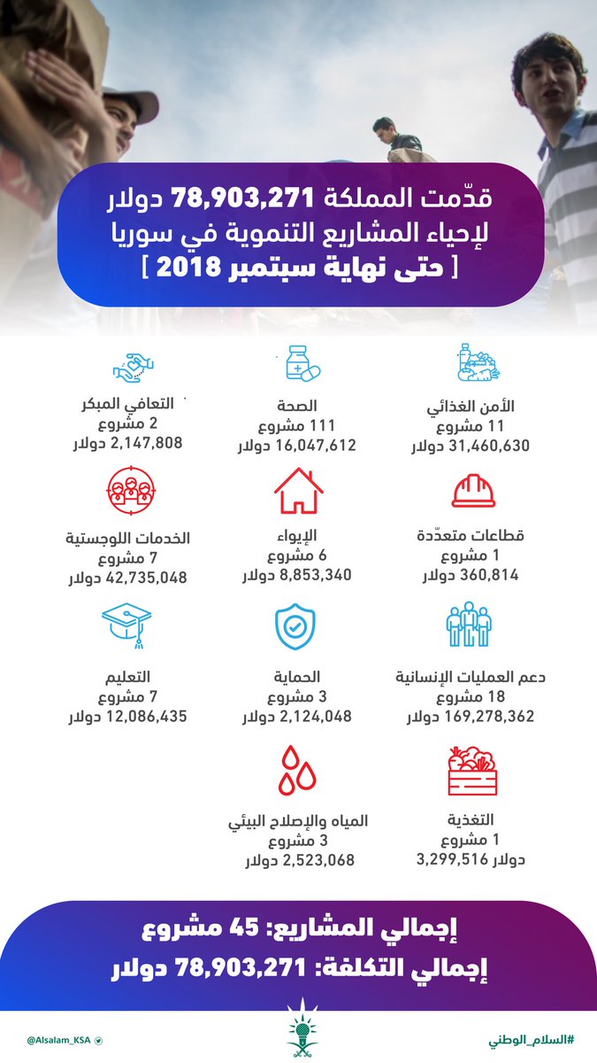 *- ממשלת סעודיה תרמה כמעט 80 מיליון דולר להחייאת 45 פרוייקטים של פיתוח בסוריה (נכון לסוף ספטמבר 2018).