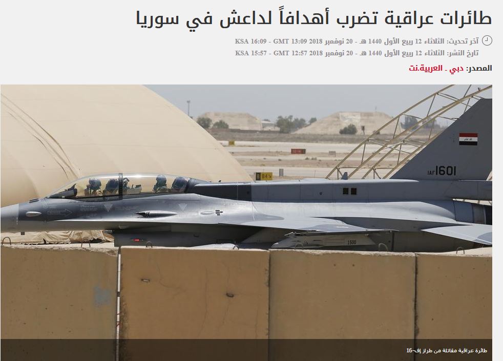 חיל האוויר העירקי תקף בהצלחה בעומק השטח הסורי באמצעות מטוסים רב-משימתיים מדגם אפ-16 את אזורי אלסוסה ואלבארוז הנמצאים כרגע בשליטתם המחודשת של דאעש.