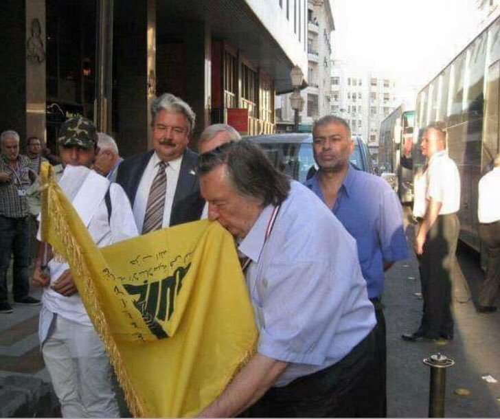 *- אלכסנדר ברוחנוב – העורך הראשי של העיתון הרוסי זפנתרה – زافنترا ועמו כמה מחברי משלחת רוסית המבקרת בסוריה מנשק את דגל החיזבאללה. לא קשה להבין את רוח העיתון.