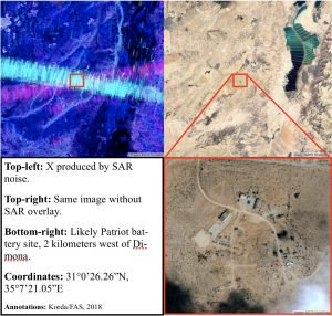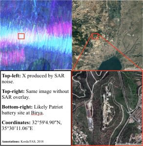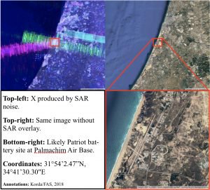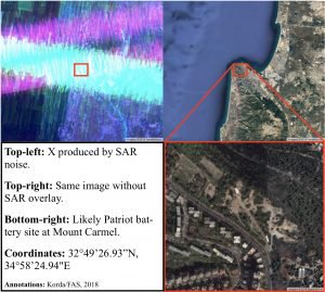 הפרשן הצבאי גיא א.: הצילום נעשה על ידי לויין סנטינל – SENTINEL-1’s C-band Synthetic Aperture Radar (SAR) – ה-״מצלם״ גלי מכ”ם. למעשה הלוויין קולט החזרים מהקרקע ומכל אובייקט ומייצר תמונה. בגלל איזה אנומליה הוא קולט את ערוצי המכם של הפטריוט. בלווין צבאי יש מכ”מ SAR איכותי מאוד והיתרון הגדול – צילום בלילה ודרך עננים. עוד נתון מעניין, הצל הוא של המכ”ם ולא של שמש. יש לזה הרבה יתרונות. למעשה הלוויין הוא ה-“שמש” במקרה הזה.