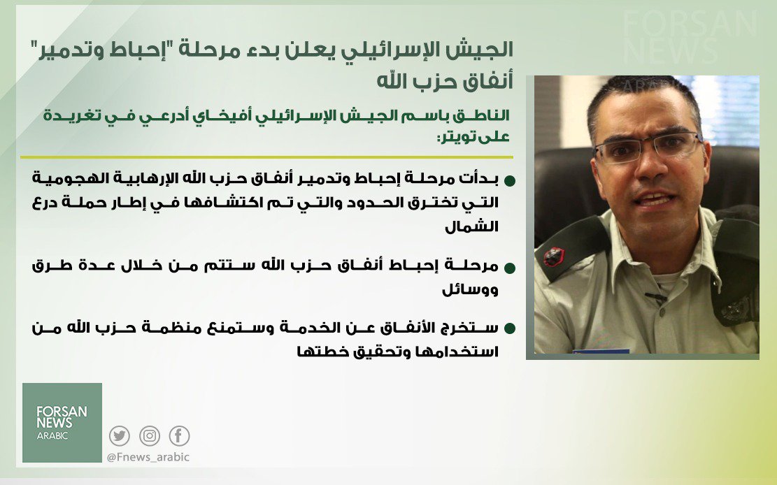 #عاجل بدأت مرحلة إحباط وتدمير أنفاق #حزب_الله الإرهابية الهجومية االتي تخترق الحدود والتي تم اكتشافها من قبل قوات جيش الدفاع في إطار حملة #درع_الشمال. pic.twitter.com/N1CyIep668
