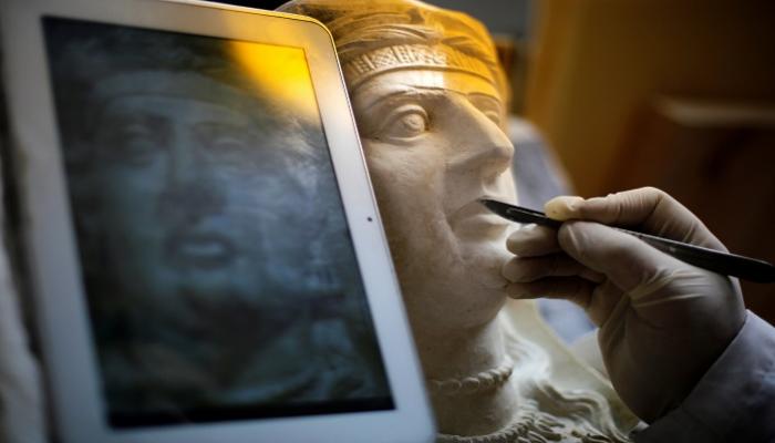 *- ממשיכים במלאכת שחזור של מוצגים עתיקים במוזאון הלאומי של העיר תדמור ממזרח לדמשק לאחר שדאעש בצע הרס שטתי במוצגים .