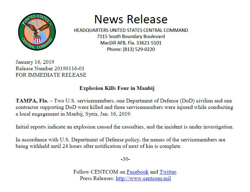 *- הודעת הצבא האמריקאי על הפיגוע: