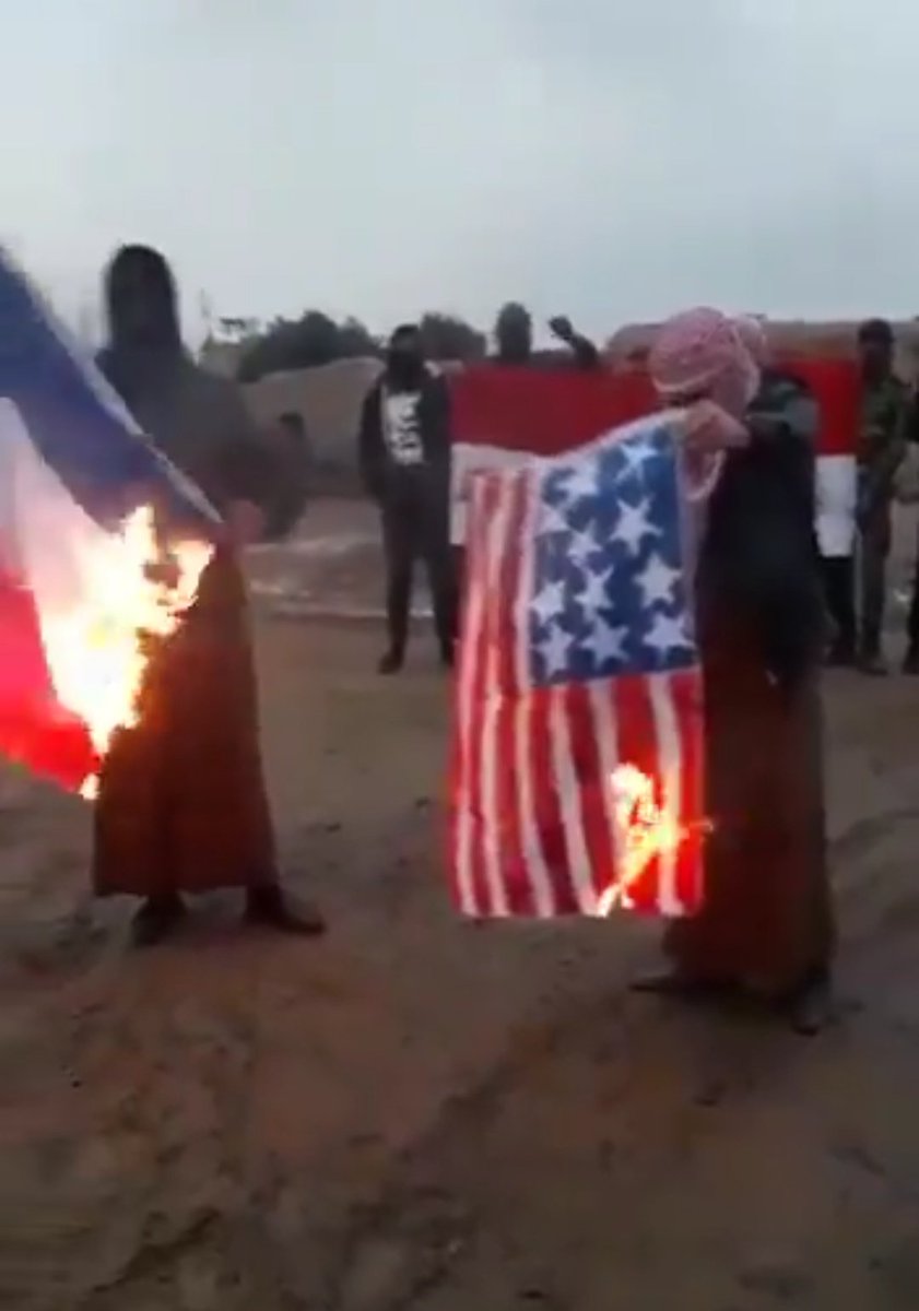 *- תושבי באזור א-רקה שבמזרח סוריה שורפים דגלי ארה”ב וצרפת וקוראים להם לצאת מסוריה.