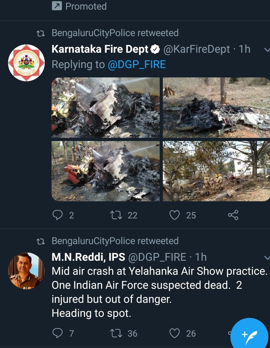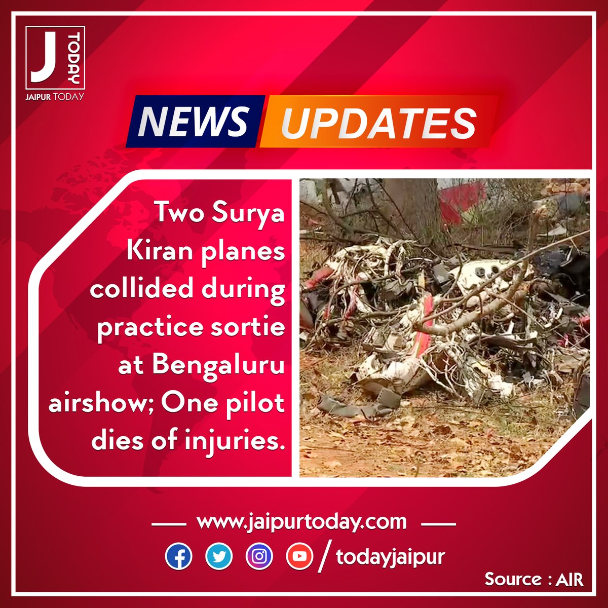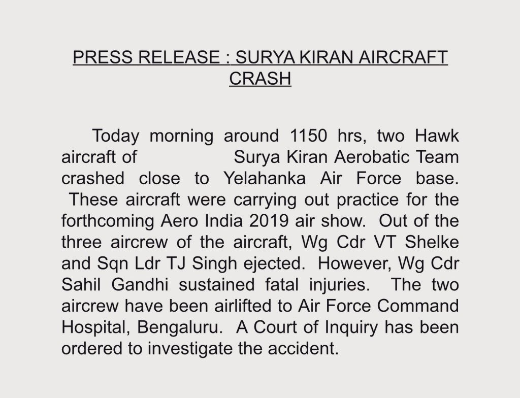 במהלך החזרות לקראת תצוגה אווירית של חיל האוויר ההודי במדינת בנגלור בדרום המדינה התנגשו  מטוסים מטייסת האירובטיקה ,טייס אחד נהרג ויתר שניים נפצעו.