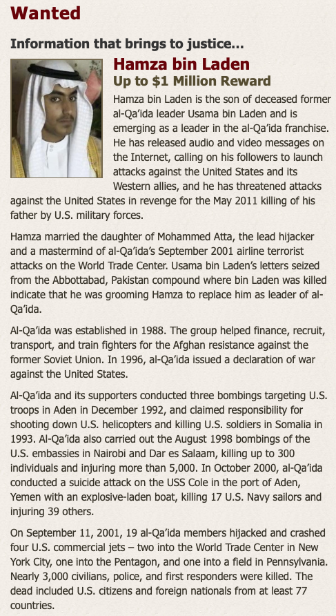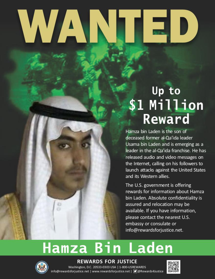 *- משרד החוץ האמריקאי פרסם הבוקר הודעת פרס על סך של 1 מיליון דולר למי שיביא ללכידתו של חמזה בין לאדן . הבן של. סכום נמוך=אישיות לא מעניינת.