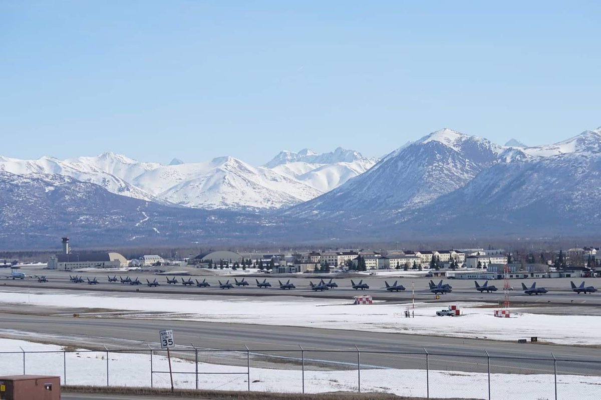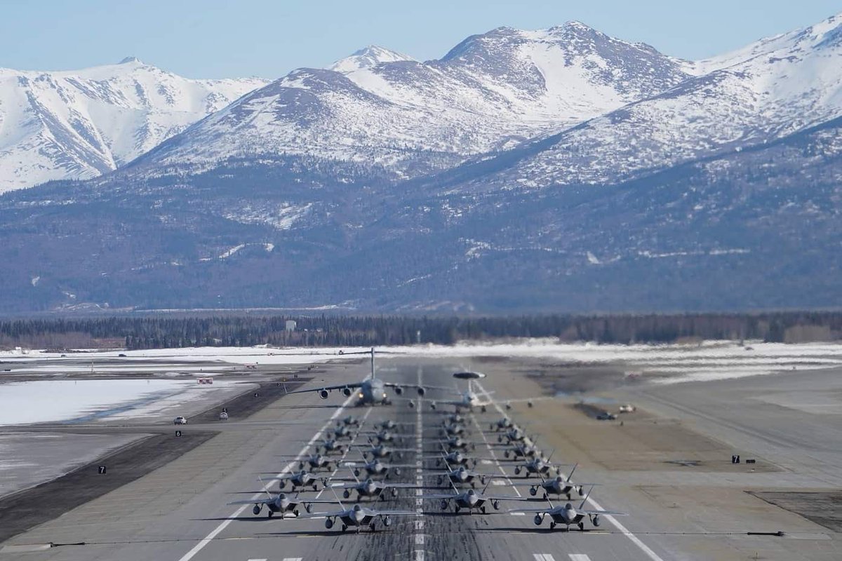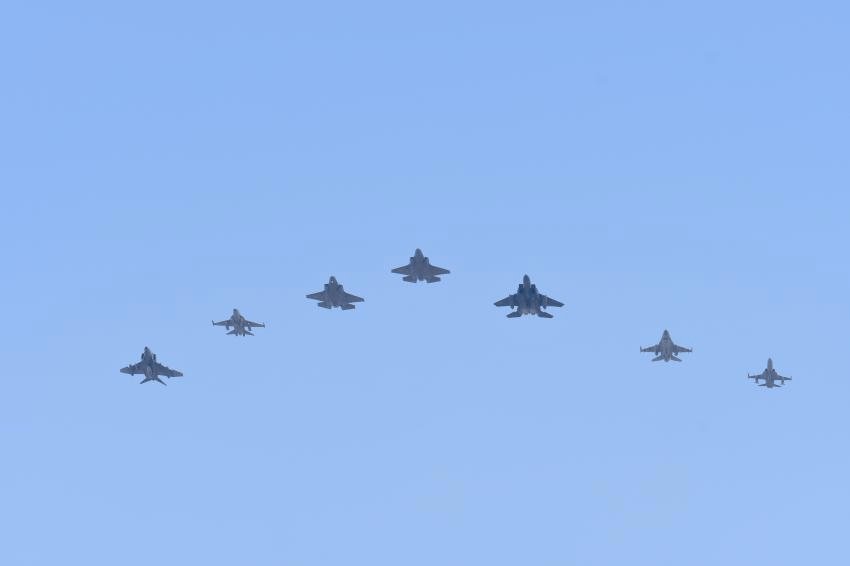 *- 12 מטוסי אפ-22 רפטור הפגינו יכולות קרביות במהלך ביצוע “הליכת פיל” (המראה בו זמנית של כל 22 המטוסים .