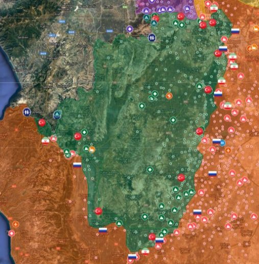 מפת פריסת הכוחות השונים מסביב למחוז אידליב שבצפון סוריה. כמו שנראה על המפה הכוחות האירנים והרוסים פרוסים בצפיפות לאורך האזור המפורז ותפסו עמדות לאורך הציר הנפרש מצפון מזרח לטריה ועד מערבית לעיר חאלב שבצפון המדינה:
