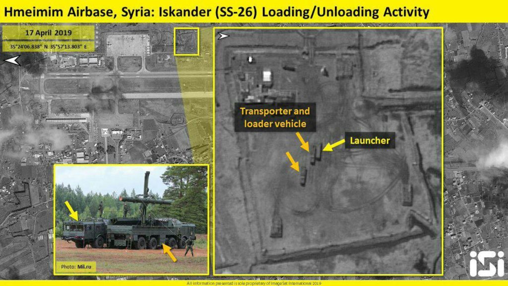 תצלום אוויר שפרסמה היום החברה הישראלית אימג’סט אינטרנשיונל – ISI חושפת כי רוסיה הציבה בבסיס חיל האוויר שלה בסוריה-“חמימים, טילים בליסטיים מדגם SS_26 איסקנדר , בעלי יכולת נשיאה של ראשי חץ גרעיניים. טילים אלו יכולים גם להיות חמושים בראשי נפץ קונבנציונליים כולל ראשים מתפצלים וראשי דלק-אוויר בעלי אפקט פיצוץ חזק במיוחד, וראשים המסוגלים לחדור לעומק האדמה ולפגוע בבונקרים מחופרים היטב וכן עם ראשים המייצרים פולס אלקטרו-מגנטי המסוגל לשתק מכשירי רדאר.