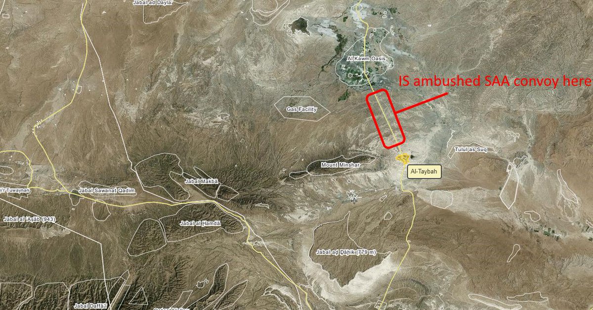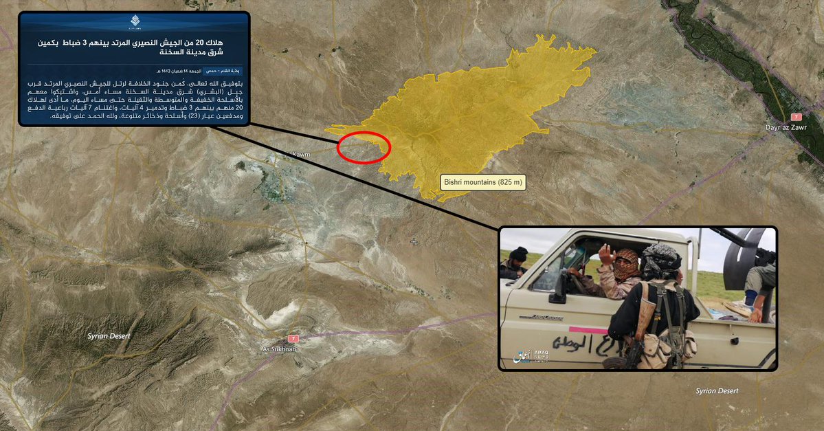 בימים האחרונים הצליח דאעש בגדול. שיירה צבאית סורית גדולה, שנסעה על ציר תנועה צפונית מזרחית לעיר אלסוחנה,בקרבת הר בישרי , הותקפה מהמארב על ידי דאעש . לפחות 20 חיילים וקצינים מצבא סוריה נהרגו. השלל של דאעש כלל 7 רכבים ממותקנים במקלעים כבדים ו-2 תותחי שדה וכלי נשק ותחמושת לרוב איתם הם נמוגו במרחבי המדבר העצום המשתרע באזור.