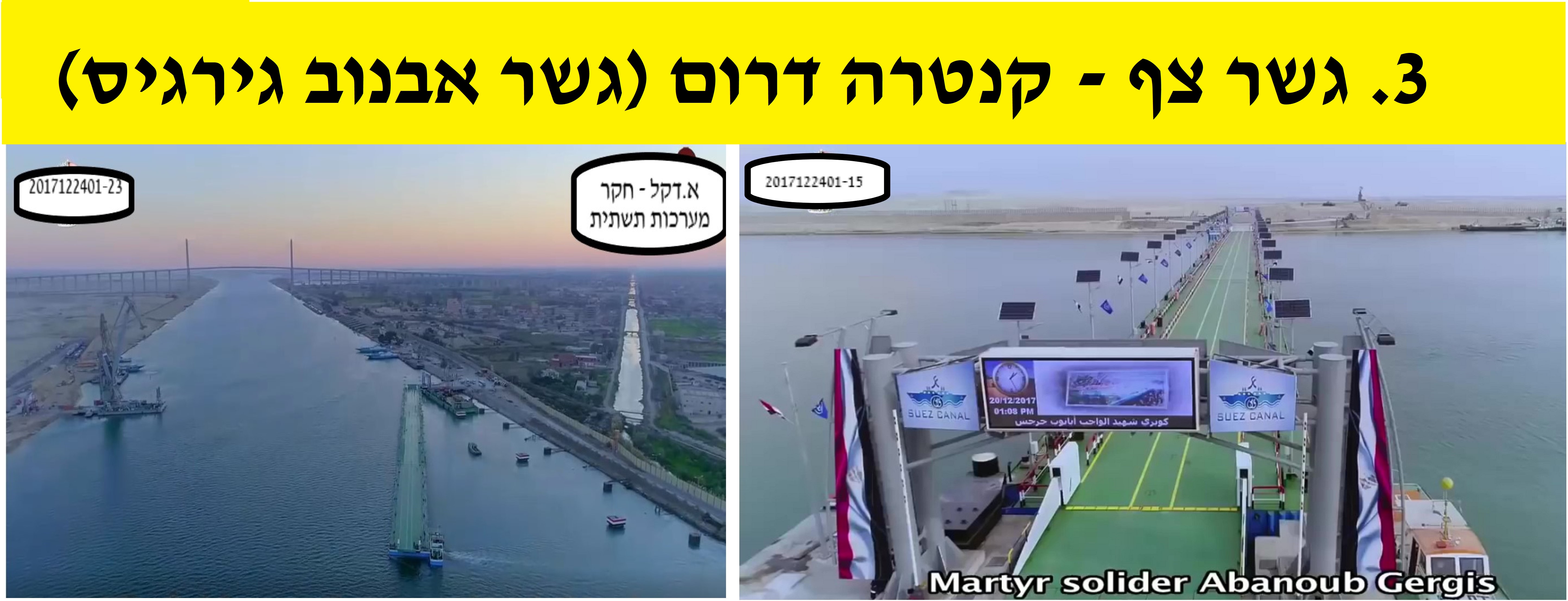 - גשר צף – קנטרה דרום (גשר אבנוב גירגיס). גשר מסדרת הגשרים הצפים החדשים בתעלת סואץ. האורך הכללי של הגשר כ-340 מטר ורוחבו כנראה 15 מטר. בגשר יש חלקה צפה באורך 285 מטר הנפתחת כדי לאפשר מעבר אוניות. העבודות החלו בסוף שנת 2017, וכנראה שכבר הסתיימו- ראה צילום להלן.