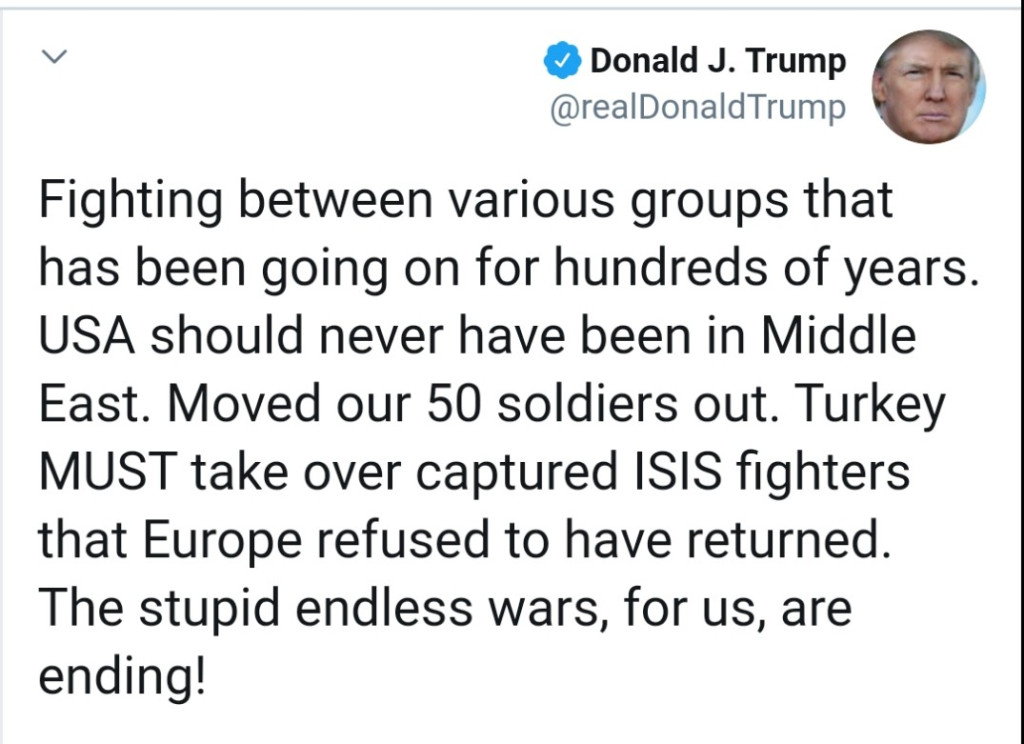 “לחימה בין מגוון קבוצות שנמשכת מאות שנים. ארצות הברית מעולם לא הייתה צריכה להיות במזרח התיכון. הוצאנו את 50 החיילים שלנו החוצה. טורקיה חייבת להשתלט על לוחמי דאעש, השבויים שאירופה סירבה לקחת בחזרה. המלחמות המטופשות והאין-סופיות, עבורנו, מסתיימות!” – כך צייץ טראמפ בטוויטר.