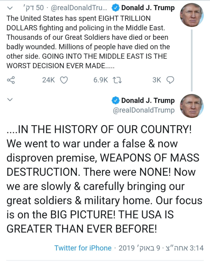 “ארצות הברית בזבזה שמונה טריליון דולר על לחימה ושיטור במזרח התיכון. אלפי חיילים מצטיינים שלנו מתו או נפצעו קשה. מיליוני אנשים מתו בצד השני. להיכנס למזרח התיכון זו ההחלטה הגרועה ביותר שאי פעם התקבלה בהיסטוריה של המדינה שלנו!” – צייץ טראמפ בטוויטר.