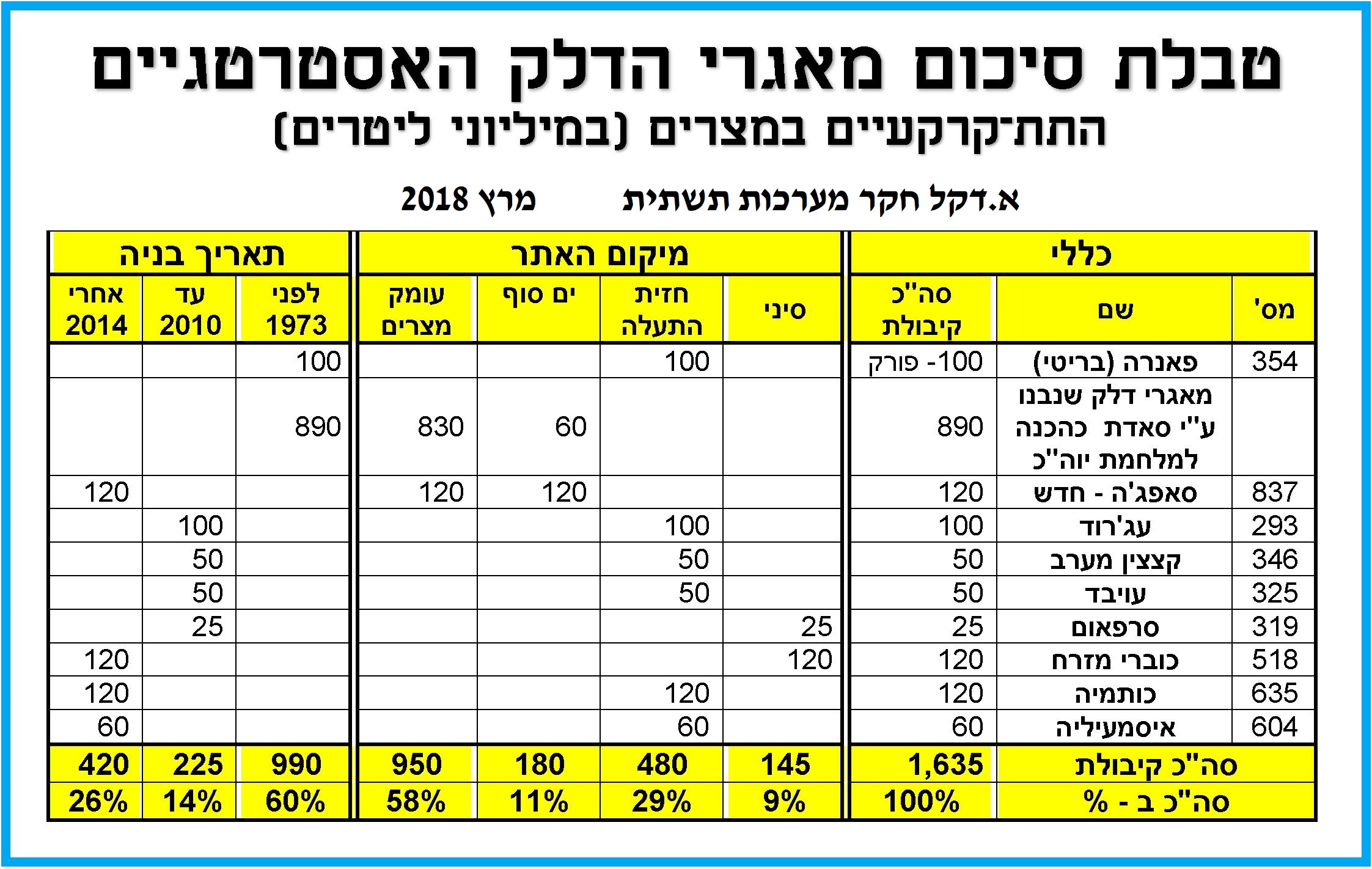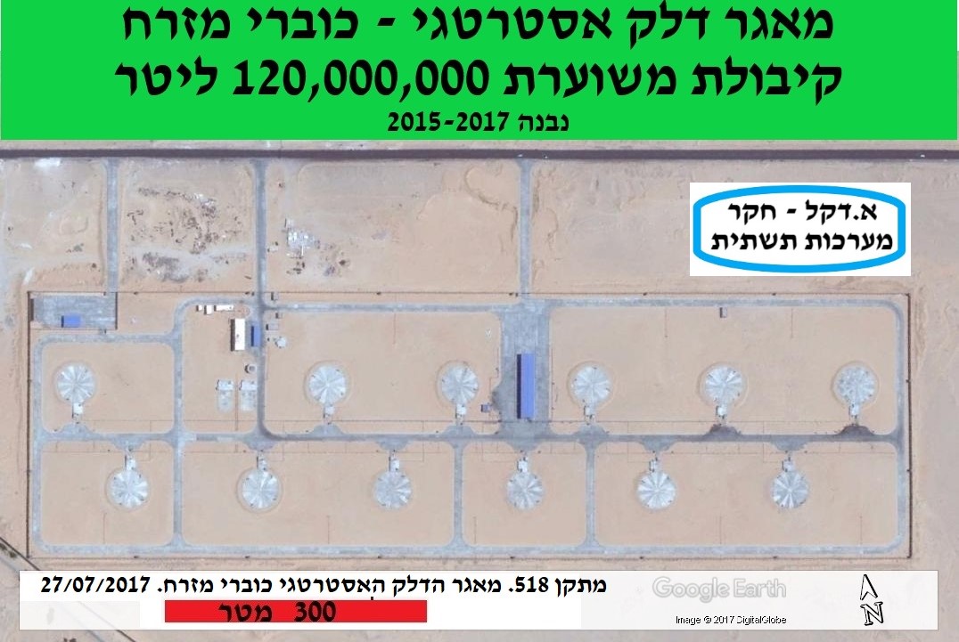 סה”כ בשנים 2015-2017 בונה מצרים מאגרי דלק תת קרקעיים בקיבולת כוללת של כ־420 מיליון ליטר דלק. בניה זו משלשת את מאגרי הדלק, שנבנו במצרים לאחר הסכם השלום. יודגש כי במקביל לבניית המאגרים התת־קרקעיים נבנות במצרים חוות מכלי דלק על־קרקעיים, הן בבתי הזיקוק והן כמתקני חלוקה אזוריים של דלק לצרכים אזרחיים – ראה להלן דוגמא של מתקן אגירת הדלק התת-קרקעי בכותמיה, שבד בבד עם בנייתו נבנו לצידו 2 חוות אגירת דלק של חברות מסחריות.