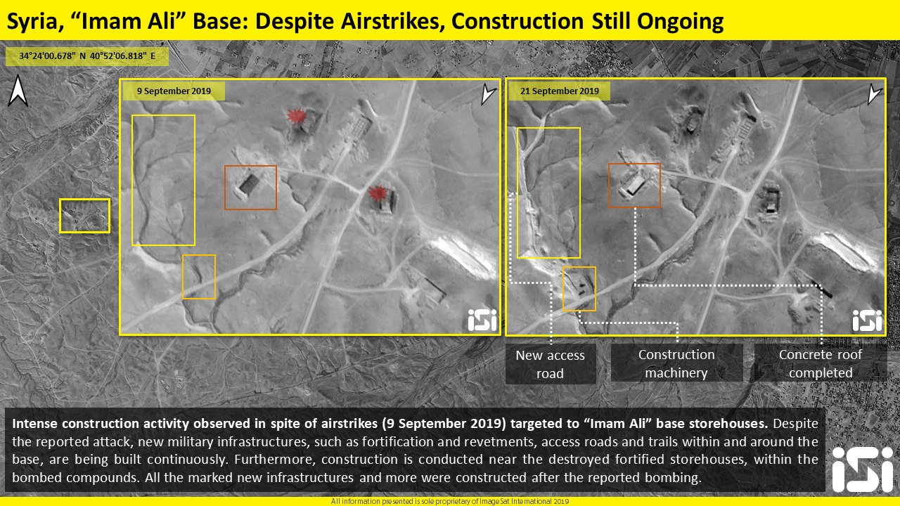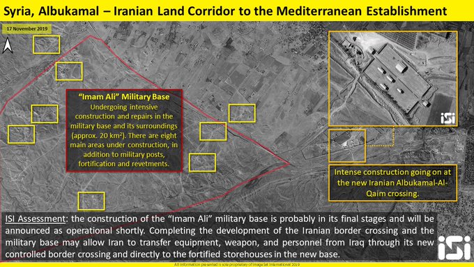 “חברת הלווין ImageSat פרסמה תמונות מהבסיס הגדול, המכונה אימאם עלי, בגבול סוריה עיראק. על פי התיעוד, הבנייה ממשיכה באינטנסיביות”.