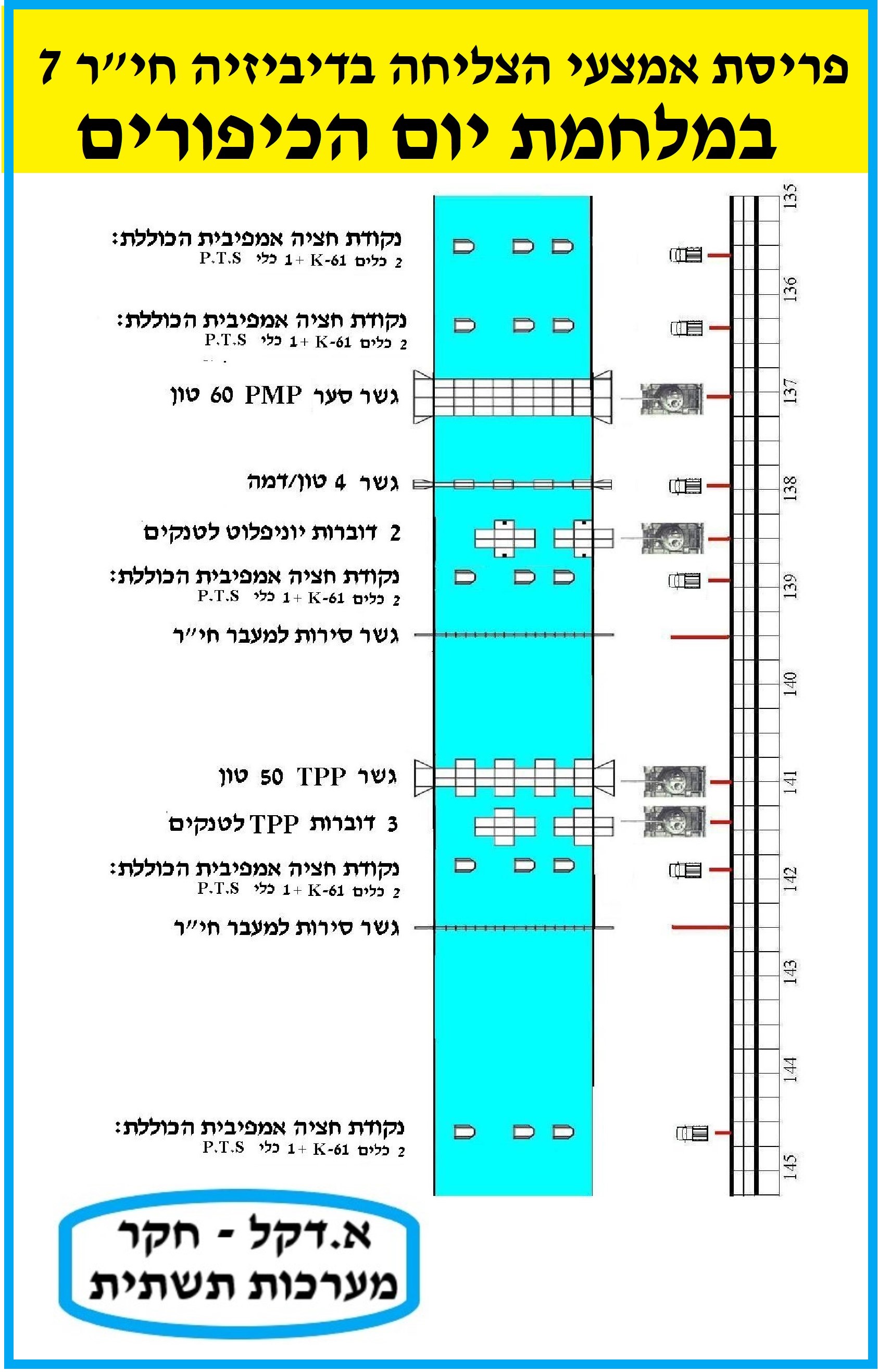 מניתוח השטח של תעלת סואץ עולה, כי ניתן לחצות את התעלה ב-5 גזרות דיביזיוניות.  השטח מאז לא השתנה, לפיכך מצאתי לנכון להביא בפניכם פרוט מדויק של פריסת מערך צליחה של דיביזיה במלחמת יוה”כ. במקרה שלפניכם המדובר הוא בדיביזיית חי”ר 7 שחצתה את תעלת סואץ בגזרת ג’ניפה – שלופה (ק”מ 133-145 בתעלת סואץ) מערך זה נראה ישים גם כיום, וזאת למעט גשרי הסירות לחי”ר, שכיום אין בהם צורך. [ראה להלן].