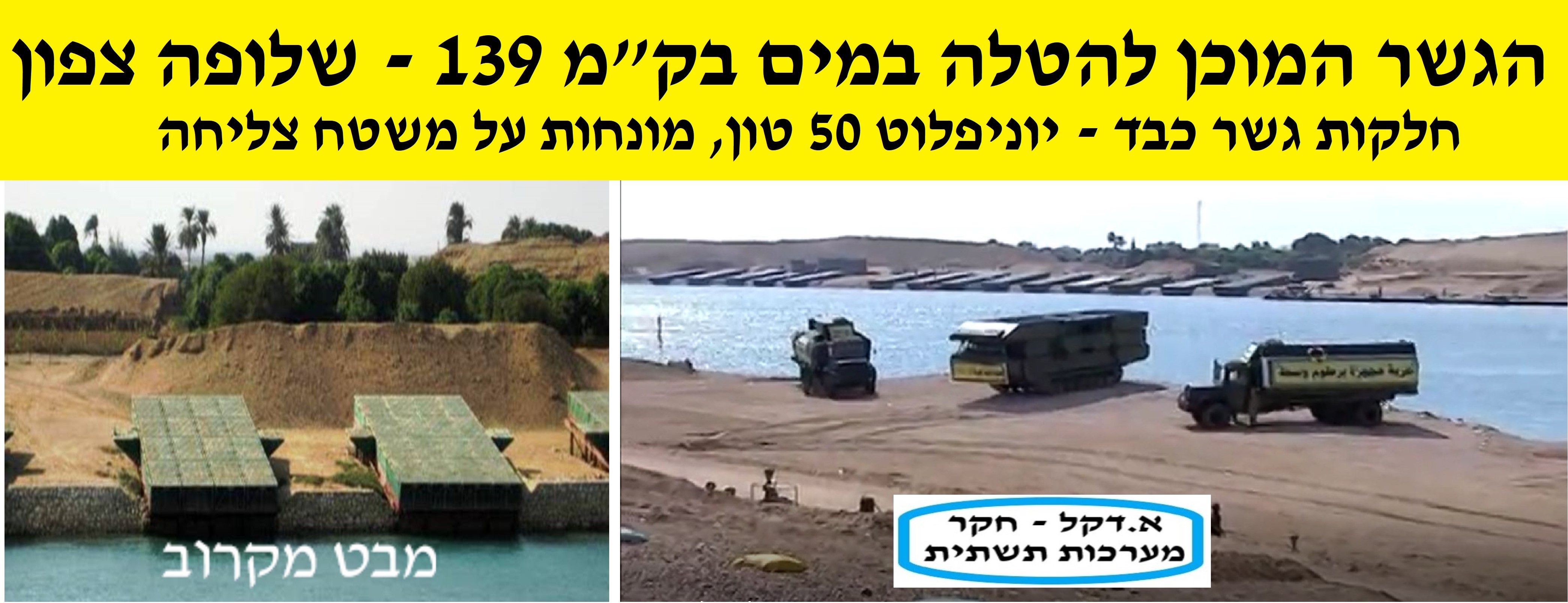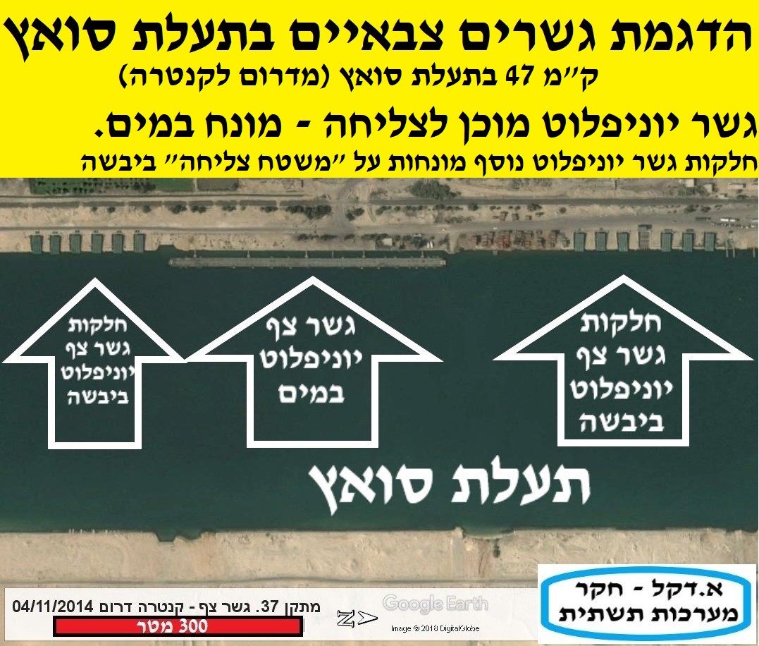 כמה מילים על גשרי יוניפלוט כבדים 50 טון: סוג גשר זה היה מרכיב חשוב במערך הצליחה המצרי במלחמת יוה”כ (הוא גם היה ה”כוכב” של מערך הגישור הישראלי במלחמה זו). גם כיום גשר היוניפלוט הוא השלד, שעליו מושתת מערך הגישור המצרי. מדובר בקוביית פלדה (פונטון) בגודל ½2 X ½2 מטר באורך של ½5 מטר, שבאמצעותה ניתן, כמו בלגו, להרכיב אמצעי גישור שונים כגון גשרים קלים, בינוניים, וכבדים (בהתאם למספר הפונטונים המונחים לרוחב הגשר) ודוברות במעמסים שונים. (לרכב, לטנק בודד, לשני טנקים). היתרון בשיטת גישור זו הוא, שניתן לקבוע את חוזק הגשר בהתאם לצורך ולנוחות התפעול. המגבלה שגשרי היוניפלוט  מורכבים  מחלקים רבים ומשך זמן ההקמה של הגשר הוא מספר שעות. בגלל סיבה זו מורכבים גשרי היוניפלוט מראש ומונחים בתעלה בשלמותם, או שהגשר מפורק ל- 16 חלקים (כל חלק כולל 16 פונטונים מורכבים) המונחים על “משטח צליחה” על שפת התעלה.