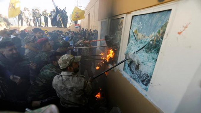 היום פרצו מאות עיראקים למתחם שגרירות ארה”ב בבגדד במחאה על הרג עשרות לוחמי חיזבאללה-עיראק בתקיפות האוויריות האמריקאיות לפני כיומיים.