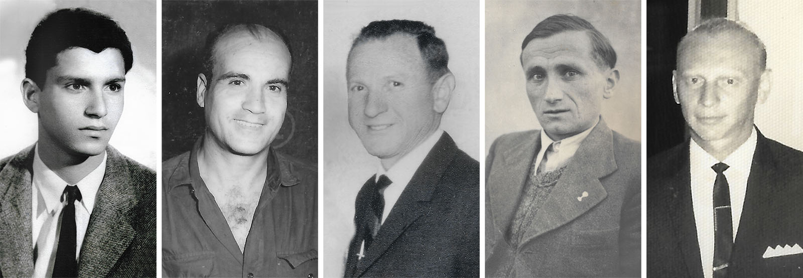 חמשת האזרחים עובדי צה”ל שנהרגו באסון המשאית. מימין לשמאל: זולי נשאור ז”ל, לייב אריה דויטש ז”ל, מנשה מלמד ז”ל, ניסים אילוק ז”ל, סעדיה אלקיים ז”ל (באדיבות המשפחות)
