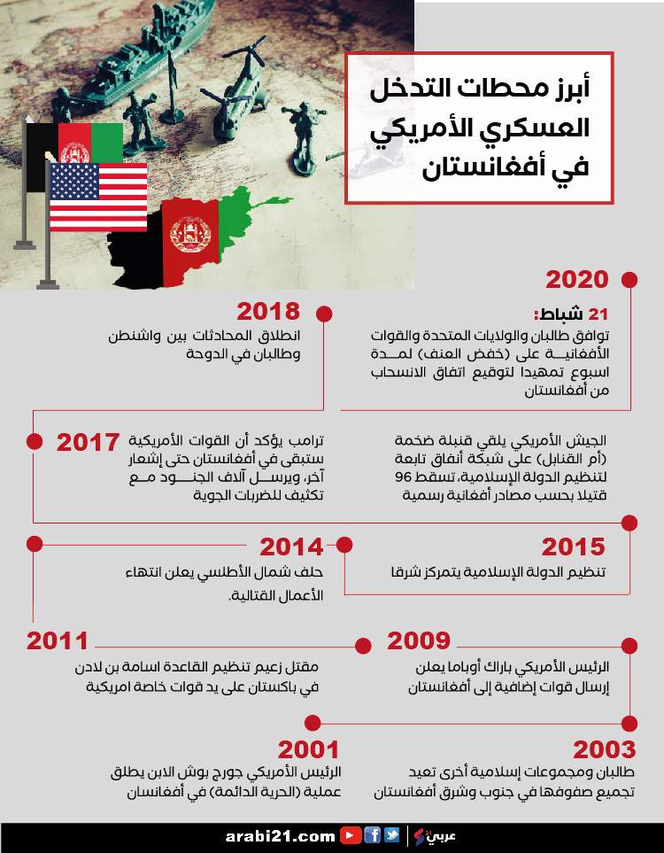 בשנת 2001 נשיא ארצות הברית ג’ורג בוש פתח במבצע הכיבוש המתמשך באפגניסטן. בשנת 2003 התארגנו “הטליבאן” וקבוצות אסלאמיסטיות נוספות, בדרום ובמזרח אפגניסטן ללחימה בקואליצית המערב. בשנת 2009 הודיע נשיא ארה”ב ברק אובמה, על משלוח כוחות נוספים לאפגניסטן. בשנת 2011 חוסל מנהיג הארגון, אוסאמה בן לאדן, באפגניסטן על ידי כוחות מיוחדים של ארה”ב. בשנת 2014 הכריזה נאט”ו על סיום פעולות האיבה מצידה,ובנתיים דאעש התחיל להתארגן במזרח המדינה בשנת 2015. שנה לאחר בחירתו בשנת 2017, אישר טראמפ כי כוחות ארה”ב ישארו באפגניסטן, ונשלחו אלפי חיילים נוספים. בשנת 2018 החלו שיחות בין וושינגטון לארגון הטאליבאן בדוחה. ב- 21 בפברואר השנה הסכימו כוחות הטאליבן, להפחית את האלימות למשך שבוע לקראת חתימת הסכם הנסיגה.