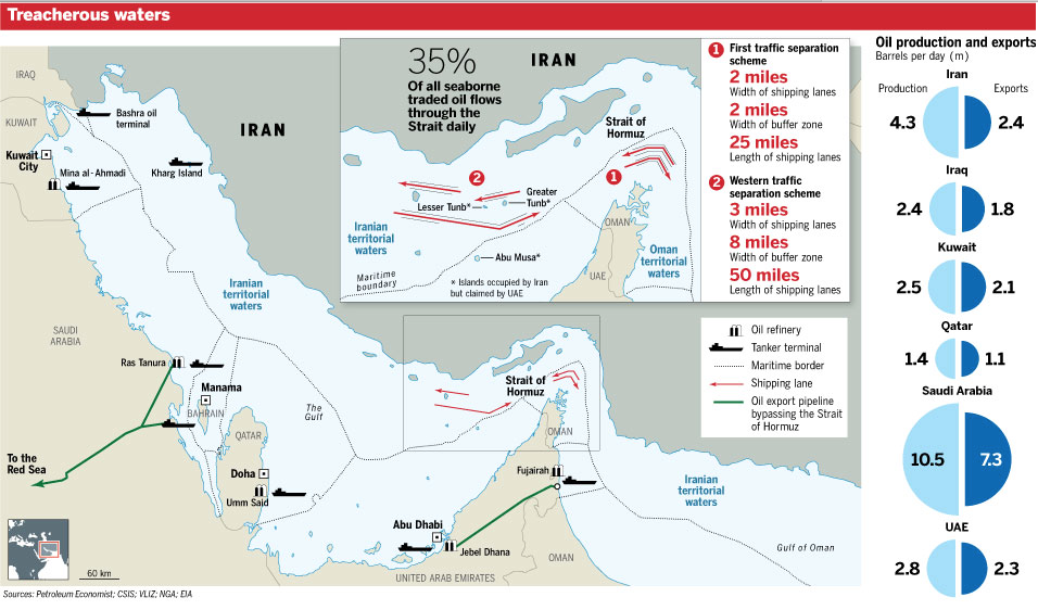 עדויות מצביעות על כך שאיראן פרסה מערך טילים נגד ספינות ורקטות גדולות המשקיפות על מצר הורמוז. המיצר חיוני לאספקת נפט ממדינות ערב במפרץ הפרסי. על נתיב מים זה מסיירים ספינות מלחמה של חיל הים האמריקני ובעלות בריתו כדי להגן על כלי שיט מפני פעולה איראנית – כך מדווח כתב העת האמריקאי “פורבס” .