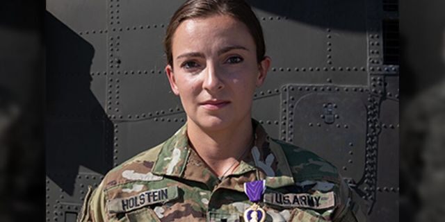 1st Lt. Abigail Holstein was presented the Purple Heart on May 3, 2020, for her injuries sustained during the theater ballistic missile attacks at Al Asad Air Base, Iraq, on January 8, 2020. Of the 27 Soldiers to receive Purple Hearts from the January attacks, 1st Lt. Holstein is one of the few 34th Expeditionary Combat Aviation Brigade recipients to return to duty after receiving initial treatment for her injuries and thus, received the Purple Heart medal in-theater. She serves as an enroute critical care nurse with Charlie Company, 3-238th General Support Aviation Battalion. (U.S. Army photo by Sgt. Sydney Mariette)