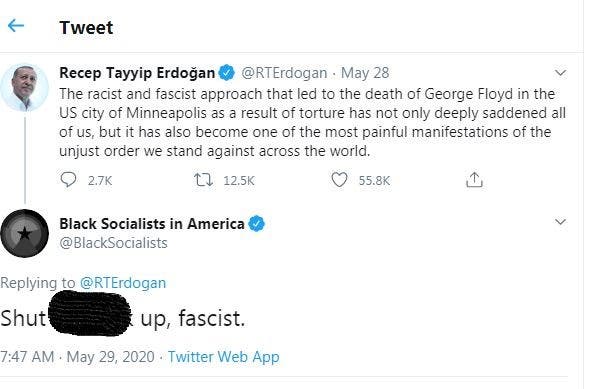 הציוץ הביקורתי של ארדואן לרצח פלויד בידי שוטר אמריקני, הביא לביקורת בתוך טורקיה ובחו”ל. דף  האינטרנט של “הסוציאליסטים השחורים” באמריקה, השיב לציוץ שלו ואמר לו “שתוק, פשיסט”.
