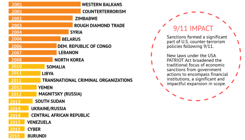 ארה”ב משתמשת בסנקציות כלכליות ופיננסיות יותר מכל מדינה אחרת בעולם. מאז אסון התאומים, האמריקאים החליטו ללכת למאמץ נרחב ובלתי מתפשר כנגד תשתיות פיננסיות וחברות שמסייעות לטרוריסטים, ארגוני פשיעה בינלאומיים, ומדינות אוטוקרטיות. ממשל אובמה אהב את כלי הסנקציות במיוחד. ב-8 השנים שלו במשרד, אובמה השתמש בסנקציות כלכליות כנגד לא פחות מ-11 מדינות וארגונים.