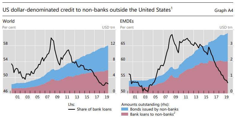 בטבלה הבאה של הבנק לתשלומים בינלאומיים (BIS) ניתן לראות את כמות האשראי (אג”ח) בדולרים מחוץ לארה”ב של כלל העולם ושל כלכלות מתפתחות, נומינלי, וגם כאחוז מהתוצר: