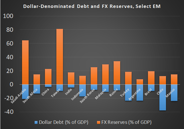 אחד המאפיינים החשובים במדינה מבחינת האיתנות הפיננסית שלה הוא כמות רזרבות הדולר (מט”ח) שהיא מחזיקה. הדולר הוא המטבע העיקרי שבו מדינות מחזיקות רזרבות מט”ח, וכמות הרזרבות המוחזקות בבנק מרכזי של מדינה הוא אחד המאפיינים החשובים בחוזק המטבע שלה ובקביעת דירוג האשראי שלה (הדירוג שקובע את דרגת הסיכון שמשקיעים לוקחים במידה והם מלווים למדינה מסויימת כסף). בטבלה הבאה ניתן לראות את החוב בדולרים כאחוז מהתוצר של מדינות מסויימות בהשוואה לכמות הרזרבות שלהם כאחוז מהתוצר: