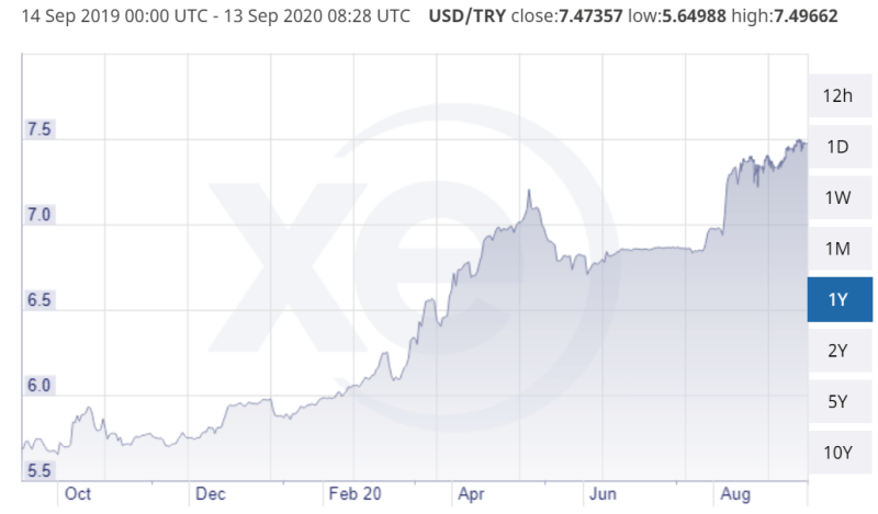 למרות שיש מדינות שראו ירידה יותר גדולה בשער המטבע שלהן, טורקיה היא אחת הדוגמאות המובהקות ביותר לבעיה שהזכרנו. הסיבה לכך היא שהמדינה נמצאת במצב רע כלכלית כבר מספר שנים ומגמת הירידה שלה צפויה רק להמשיך, לעומת מדינות אחרות שהצליחו לייצב מעט את מצבן מאז אפריל. חשבון המט”ח של המדינה צלל מרמה של 75 מיליארד דולר בפברואר לסכום זעום של 45 מיליארד על תמ”ג של 750 מיליארד. מצבה של טורקיה נחשב בעייתי כבר מספר שנים, אך בעקבות המשבר הכלכלי שהביאה הקורונה המדינה ראתה את המטבע שלה צולל לשיא שלילי של כל הזמנים של מעל 7 וחצי לירות ל-1 דולר. רק בשנה האחרונה הלירה הטורקית חוותה ירידה של לא פחות מ-26% כנגד הדולר.