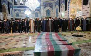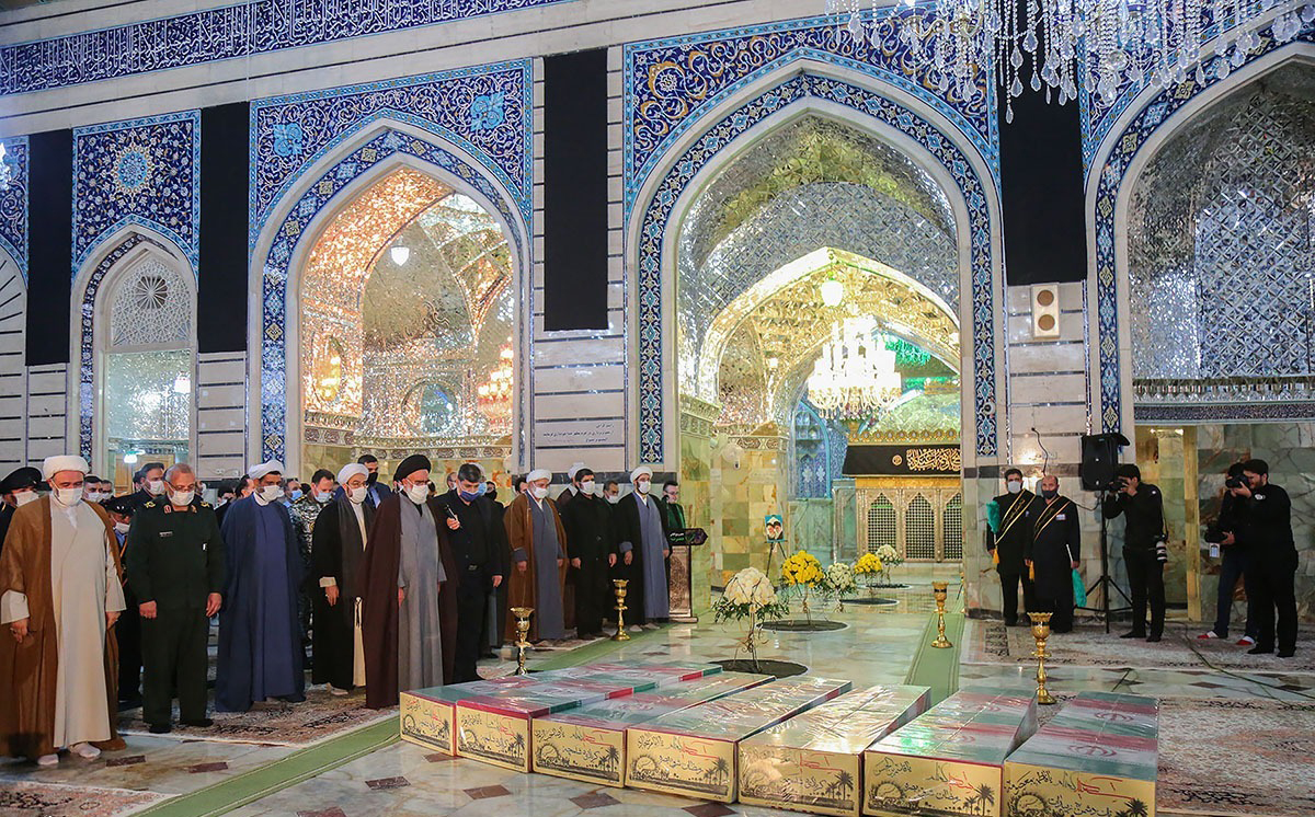 בטקס מהשבוע שעבר, במקביל לטקס החלפת הדגלים לציון האבל על יום מותה של פאטמה מעצומה, נערך טקס הלוויה לשבעה הרוגים אלמונים, שמשום מה המשטר השאיר ללא שנאמרה זהותם ומה נסיבות מותם, מתי נהרגו והיכן, וגם לא נאמר דבר מדוע הובאו דווקא למקדש הזה בעיר קום, למה ואלמונים אלו כהצהרת המשטר, זכו להחשב כשהידים של “ההגנה הקדושה”.
