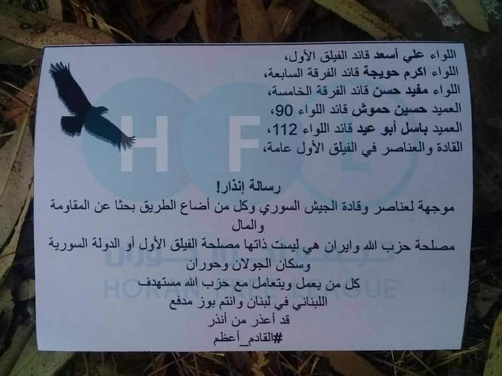 מרבית השמות הללו צויינו בעלונים שפוזרו על ידי צה”ל מעל האזורים הסמוכים לגולן הישראלי, בהם נכתב איומים ישירים, וקראו למפקדים הבכירים בצבא הסורי ולגורמים אחרים להימנע מלהתעסק במה שכונה “פרויקט חיזבאללה ואיראן” – “مشروع حزب الله وإيران” , שכן העלונים הללו אישרו כי כל מי שיעבוד בפרויקט זה יהווה מטרה לתקיפה.