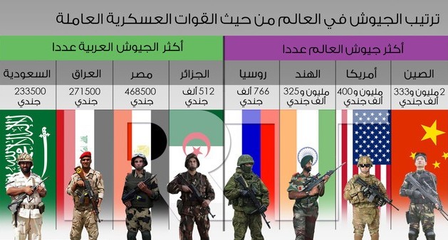 כמה מדינות ערב הופיעו בדירוג אחרי עשרת הצבאות החזקים ביותר בעולם, לפי הסדר הבא: