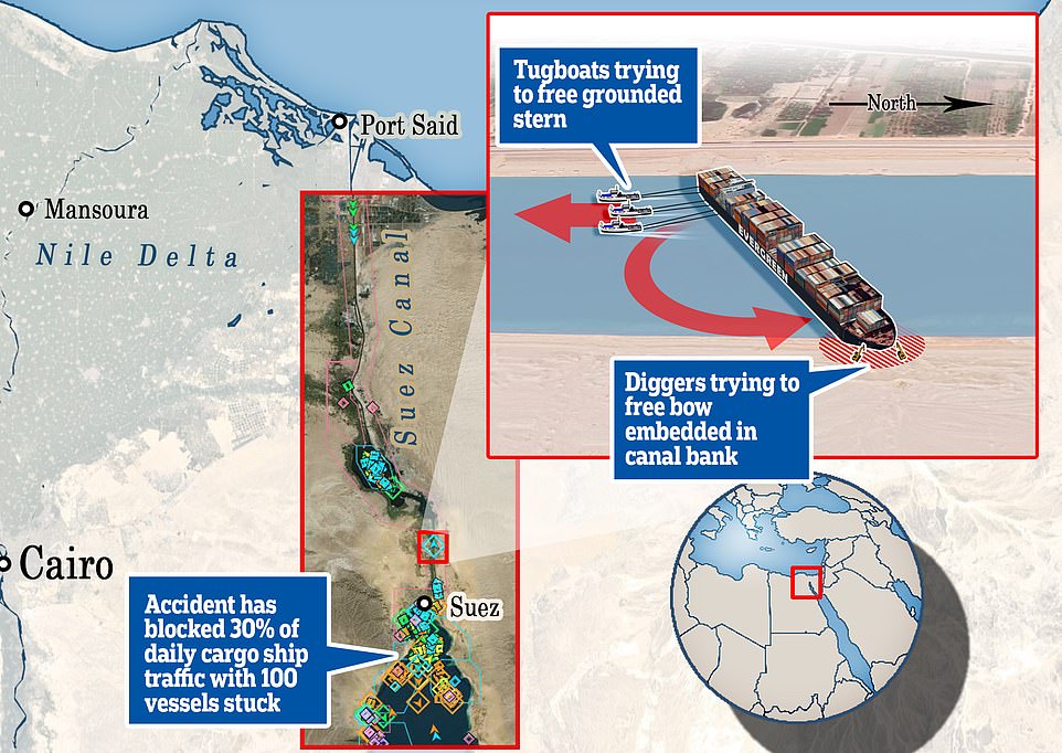 המבצע לחילוץ הספינה התקועה בתעלת סואץ עשוי להימשך שבועות והוא יהיה בעל השלכות עצומות על הסחר העולמי (חוסמת משלוחים בשווי 9.5 מיליארד דולר).