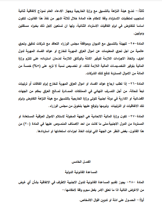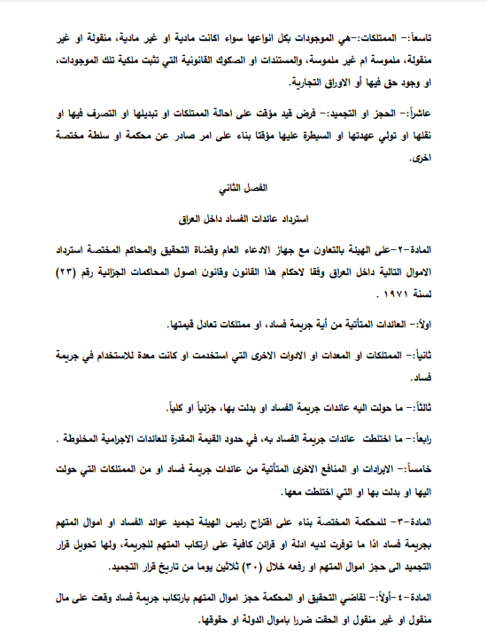 הנשיא אמר בנאומו שנשא בנושא השחיתות המינהלית והפיננסית בעירק (23 במאי 2021) כי “טיוטת החוק כוללת צעדים להשבת כספי שחיתות, וכוללת תמיכה בכספים ומוסדות פיקוח והפעלת הכלים שלהם. ”