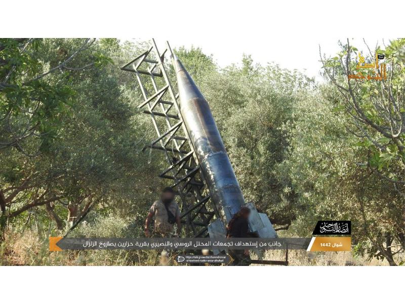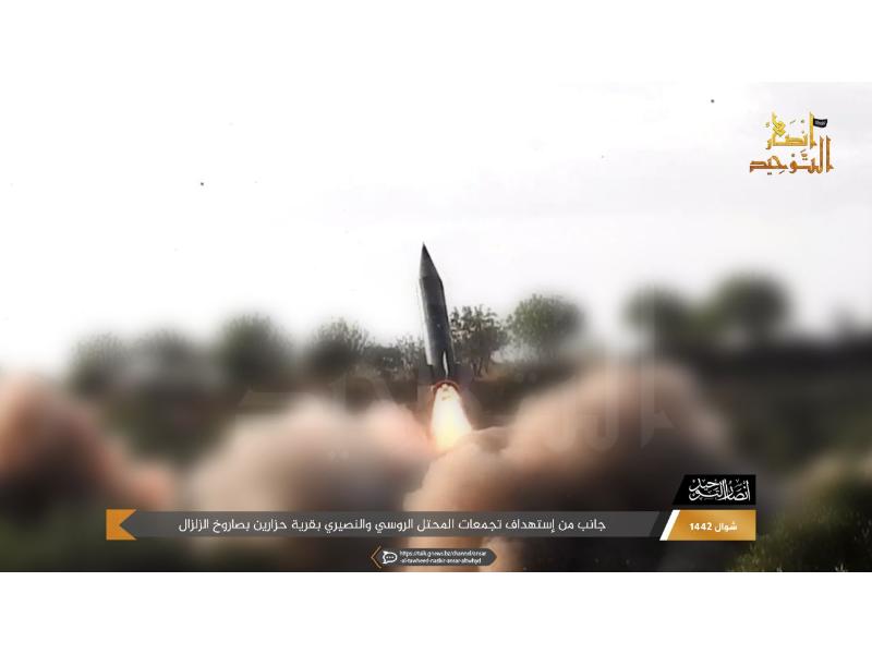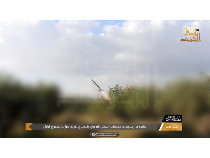 מיליציית “אנסאר אל-תוחיד” – “أنصار التوحيد” החברים בחדר המבצעים “להעיר את המאמינים” “وحرض المؤمنين” – פרסמה תמונות המציגות את רגעי שיגור הטיל בשם “אלזילזל” (800-G1) לעבר עמדות מיליציית אסד בעיירה חזארין – حزارين באזור הכפרי הדרומי של אידליב.