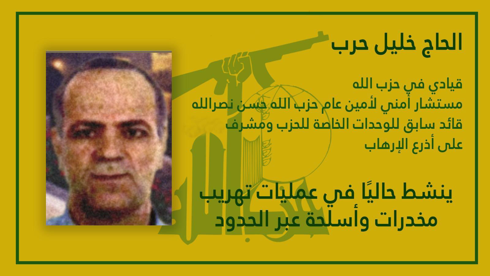 חג’ג ‘חליל חרב הוא מפקד בולט של חיזבאללה; לאחר שעשה כמה תפקידים ,כמו פיקוד על יחידות מיוחדות בארגון זה, הוא נחשב לאחד מבכירי הזרוע החמושה של חיזבאללה והמפקח על פעולות הברחת סמים ונשק ברחבי גבול לבנון.