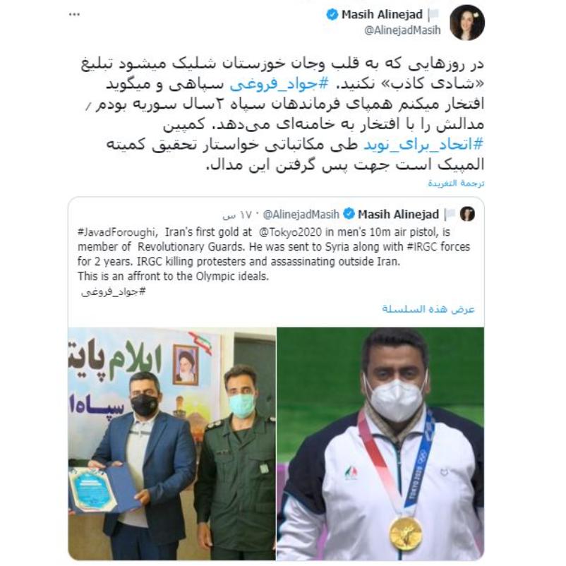 אתמול, שבת, עיתונאית איראנית בשם מסי עלי ג’וואד פרסמה ציוץ בעמוד הטוויטר שלה ובו אמרה כי המתמודד פורוטי, שזכה ביום שבת במדליית הזהב הראשונה בתולדותיה של איראן בתחרות ירי, נמנה על שורות מיליציית משמרות המהפכה האיראנים ושרת בסוריה קרוב לשנתיים.