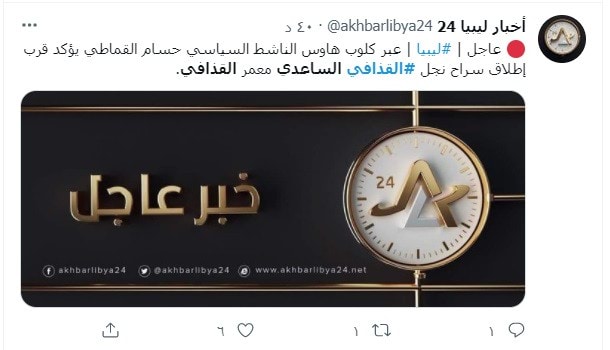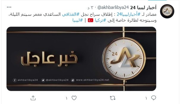 סוכנות הידיעות – “חדשות לוב”, באמצעות חשבון הטוויטר שלה, ציטטה מקורות שהיא הגדירה כפרטיות, ואמרה כי “שחרורו של בנו של קדאפי, א-סעאדי מועמאר, יתבצע הערב, והוא יטוס במטוס פרטי לטורקיה”.