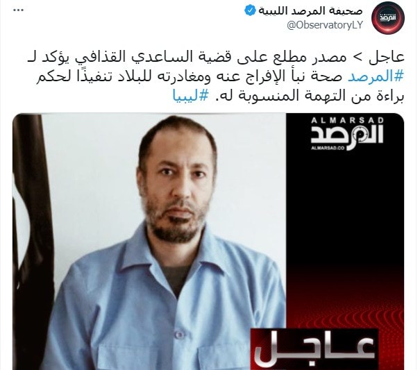 העיתון “אל-מרסאד” הלובי מצדו אישר את הידיעה על שחרורו של א-סעאדי קדאפי, וציטט בחשבון הטוויטר שלו מקור אותו הגדיר כמכיר את פרשת קדאפי, כי “שחרורו ויציאתו מהמדינה באה כיישום פסק הדין שזיכה אותו מהאישום נגדו “.