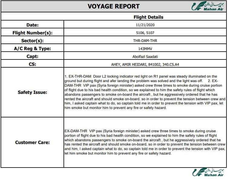 מנגד, מהמסמך שהודלף עולה כי “מאהאן אייר” הייתה שותפה ברורה להסתרת בעיות דיפלומטיות, והתעלמות עובדיה מכללי הבטיחות והביטחון, שכן במסמך נכתב כי צוות הקבינה איפשר לשר מקדאד לעשן במהלך טיסת המטוס, תוך הפרה של חוקי התעופה.