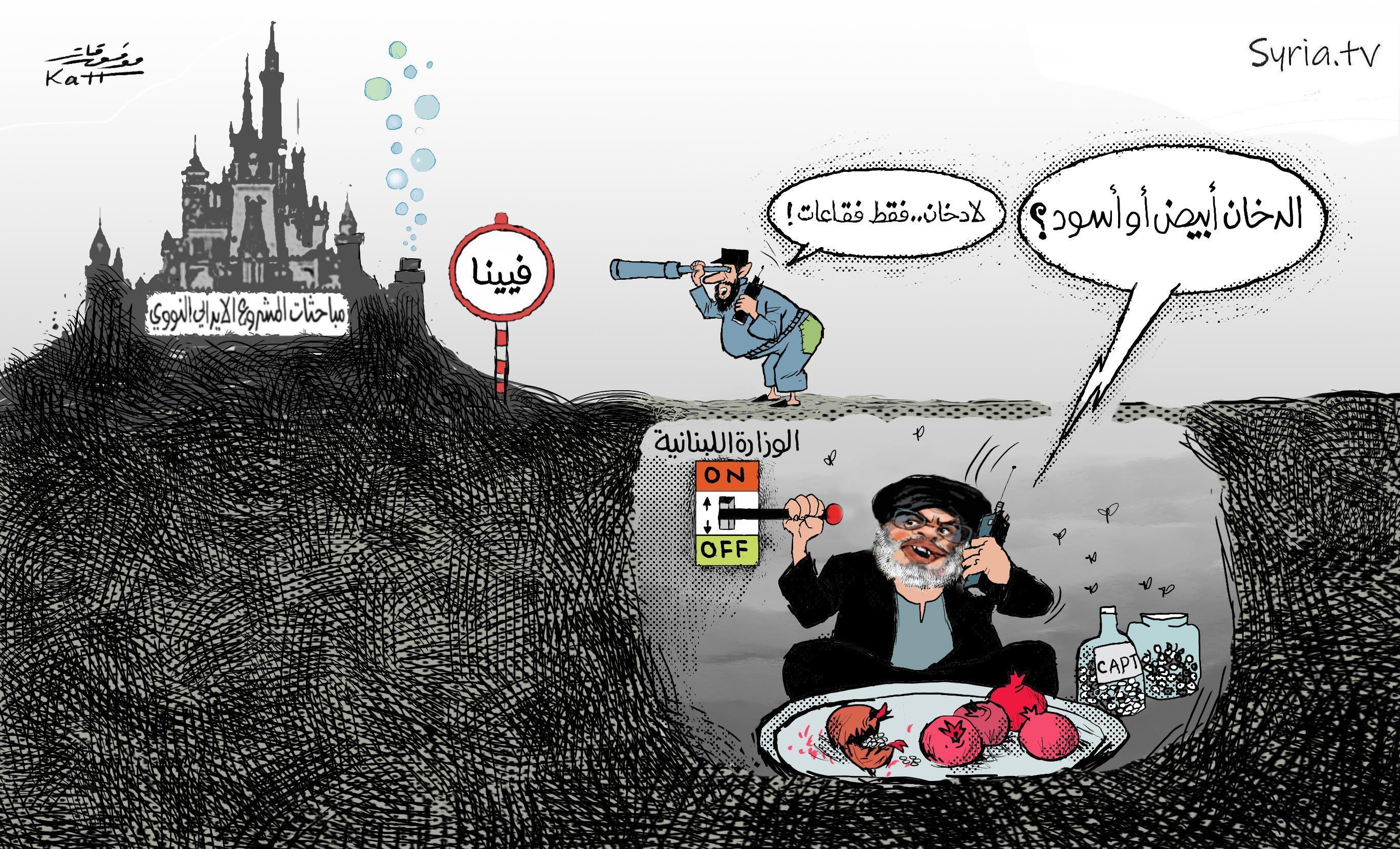קריקטורות נאסראללה ממתין להכרעה בשיחות הגרעין עם איראן לפני שהוא משתלט על לבנון 15/12/202114/12/2021 Nziv איראן, הסכם הגרעין, חיזבאללה, לבנון יצרן כדורי הסם קפטגון וסוחר הסמים – חסן נאסראללה שואל את הצופה בוינה, כשהוא מסתתר במחילתו ולפני שהוא נותן את האות להשתלט על הממשלה בלבנון: “האם עשן לבן יוצא מהבית בו נערכות שיחות הגרעין עם איראן או עשן שחור ?” ונענה: ” אין עשן … יוצא סתם בועות”.