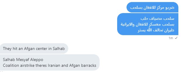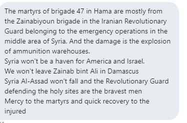 *- דברי קצין אירני בכיר הנמצא בסוריה: “רוב ההרוגים במתחם חטיבה 47 הם מחטיבת אלזינביון השיעית-אפגנית והם פועלים בסוריה להגנה על מקדש זינב. אנחנו לעולם לא נעזוב את סוריה ולא ניתן לאסד ליפול .איחולי החלמה לפצועים”.
