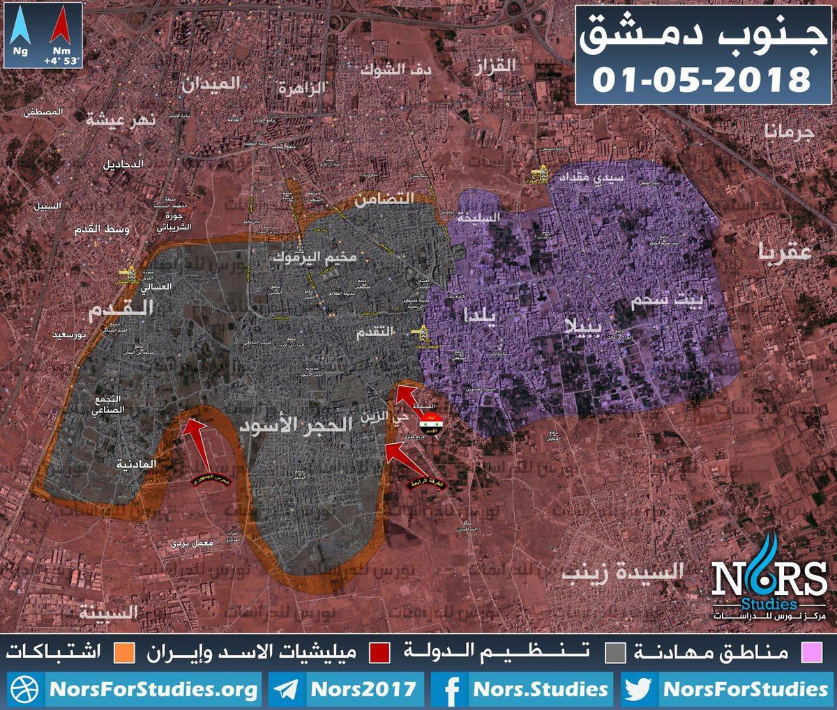צבא סוריה מנהל כבר כמה ימים,בעזרת הרוסים , מו”מ עם דאעש להתפנות ממחנה ירמוק ושכונת אלקדם וחאג’ז אלאסואד מבלי להמשיך בקרב הגורם לכל האזור להפוך לתל חרבות. יש לציין כי דאעש עדיין שולט על כ-70 אחוז מהשטח שמדרום לדמשק.