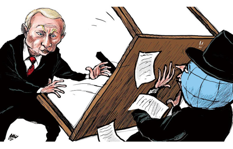 קריקטורות ברקע הפלישה לאוקראינה: נשיא רוסיה הופך את שולחן המו”מ על המערב 25/02/2022 Nziv אוקראינה, אירופה, ארה"ב, רוסיה העיתון הסעודי אשרק אל-אווסט פרסם קריקטורה המדגישה את המשבר האוקראיני ואת הדרך שבה התמודד עמו נשיא רוסיה ולדימיר פוטין.