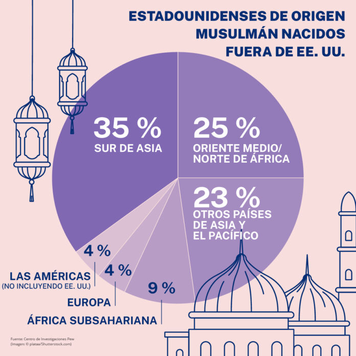 מתוך סך מוערך של 3.45 מיליון מוסלמים אמריקאים מכל הגילאים שחיו בארצות הברית בשנת 2017, 58 אחוז נולדו במדינה אחרת, על פי מרכז המחקר Pew.